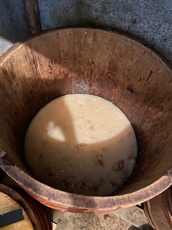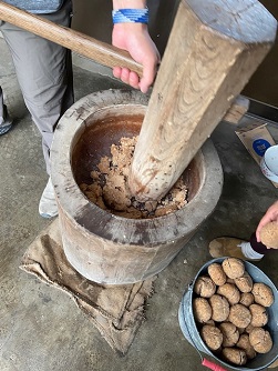こんにちは! ひまわり不動産の増澤です 旦那さんの実家にて 味噌作り第2弾! 2週間ほど吊るして干した みそ玉を漬ける作業ですカチコチに固くなって 醗酵したみそ玉を 杵と臼で潰します こんな感じ~ 年末の餅つき以来の 杵と臼の出番です