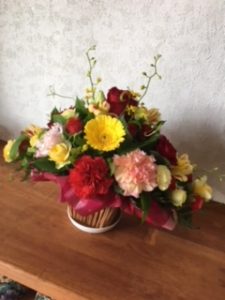 昨日がお誕生日だった私 素敵なプレゼントが届きました!バスケットに入った フラワーアレンジメント お義母さんと叔母さんから 嬉しくてスグにお礼の電話しました お花は事務所の玄関にお引越し パッと明るい玄関に変身~