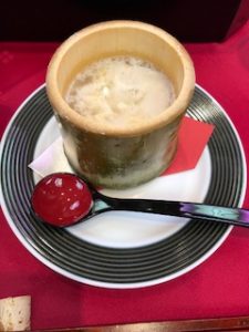 ナイアガラのスパークリングで乾杯 その後はお料理ごとに ワインが注がれて~ 竹筒入りのスープは『キジ』