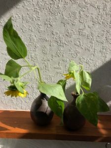 事務所の脇の過酷な環境で ひまわりが咲き始めてます8月に入ってつぼみが出来始めたら 一気に背丈が伸びました 花は小さいけれど 花の大きさに比べて 幹が細い・・・ で、先日の強い風で 倒れてしまった ひまわりがあります 今朝、お水をあげてたら 倒れたひまわりから 花が咲き始めてた! 今朝の状態がコレ↓
