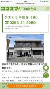 地域の不動産ポータルサイト 『ココスマ』にて 売却ページが出来ました! これはスマホバージョン パソコン版も見やすいですねご売却を考えておられる背景には 色々なご事情があると思います 大切な財産を手放すにあたり 何から手を付けたら良いのか 分からない方が多いのではないでしょうか そんな時にこの 『ココスマ不動産売却版』 は便利だと思います ここ松本だけでも 多くの不動産会社さんがあります その中で3社の不動産会社さんから 査定をして貰う事が可能です ひまわり不動産の場合 査定は代表の私、増澤が 責任を持って行わせて頂きます もちろん相談は無料・秘密厳守です! 創業4年目、不動産業界20年 松本市在住半世紀の私です 併せて『ひまわり不動産売却ページ』 も参考にして頂けると嬉しいです それではどうぞお気軽に ご相談ください ひまわり不動産株式会社 増澤京子