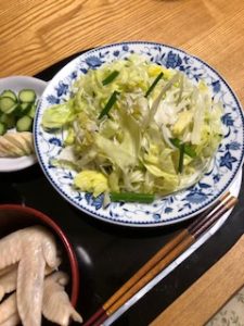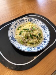 で、今日のお昼ごはんはスパゲッティで 茹でたキャベツにたっぷりしらす干し~