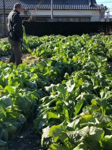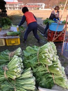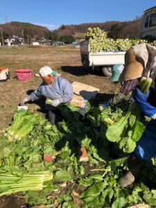 今日はお休みを頂いて 野沢菜漬けしました 信州の冬の食卓には 欠かせないお漬物だもの 先ずは、畑で霜に当たって 美味しくなった野沢菜刈りから 場所は塩尻の『勝弦(カッツル)』 標高が高くて美味しい野菜が採れる所です刈った野沢菜の根に包丁を入れて 洗いやすくします 束にするのはお義父さんの係り