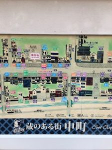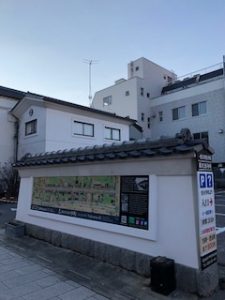 朝のウォーキングコース 中町通りで見慣れない物を発見! 今まで真っ白だった駐車場の白壁に 何か書いてある近づいてみると お店の紹介だった それも英語バージョンで 海外の観光客には 優しい看板の誕生ネね