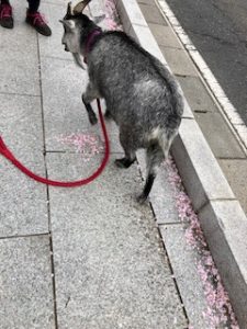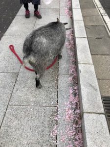 『メ~』ヤギでした 散った桜の花びら食べてました 近づいてきたけど 眼が怖くて逃げ腰の私・・・ だってイノシシみたいな ヤギだったもん ひまわり不動産(株) 増澤京子
