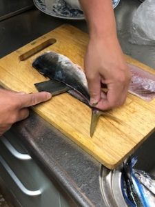 この連休に旦那さんが 釣りへ行ってきました 船で海に出た海釣りで サバ・イワシがた~っぷり 魚をおろすのは はい、旦那さんが担当です先ずはサバのタタキから 新鮮で身がブリブリ~