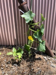 暑くなってくると 自然と食べたくなる野菜 と言えば『キュウリ』 お漬物やモロキュウに ミョウガと和えるのも大好き 先日寄せ植え用の お花を買った時に キュウリの苗を貰いました 我が家はほとんど土が無くて それでもと思って 庭の片隅に植えておきました 毎日お水をあげてはいたものの 今朝ちゃんと見たらビックリ!いつの間にか大きくなってる。。 花まで咲いてるじゃん あわてて添え木を立てて 上に伸びるようにして