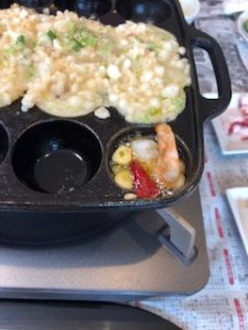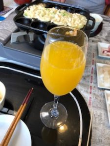 水曜日は定休日の ひまわり不動産です 今日はまったり昼飲み~ お休みならではの醍醐味です オレンジジュース& スパークリングワイン 『ミモザ』からスタート!メインはたこ焼きなんだけど 焼けるまでのお楽しみは・・・ 空いた穴でオイルフォンデュ エビやらイカやらを つまみながら~
