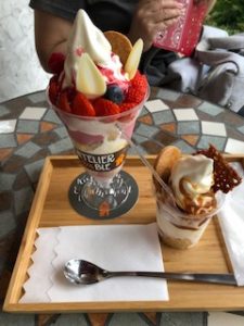 左がストロベリーパフェ 右がキャラメルサンデー 店内や外のベンチは このスイーツを楽しむ 笑顔のお客さん達で満席!