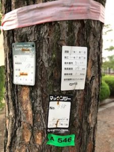 松本城のお堀の周りは お気に入りの 朝のウォーキングコース~ 今朝は気分転換に お城の庭内に入ってみました早朝から犬の散歩をする人 ジョギングする人 取り合えず朝の挨拶を交わします ん? 松の幹に何か貼ってある?