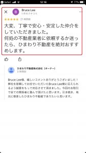 ネットが普及した事で 希望する不動産の探し方も 大きく変わりました 今は不動産探しはネットが当たり前 それもパソコンから スマホの時代へ移行してます 今日、嬉しい事が ありました! お客様がグーグルに クチコミをしてくださいました グーグルでひまわり不動産を 検索するとこんな画面なのですが・・・こんな嬉しいクチコミを 頂きました!