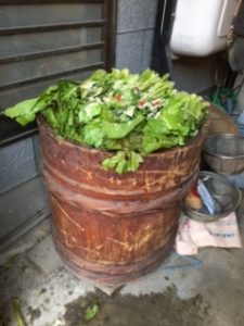 で、お塩・ザラメ・唐辛子を入れながら 樽に野沢菜をギューっとね