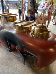 伊勢・志摩旅行の備忘録その2 お伊勢参りをしたら 伊勢名物の『赤福本店』へ 歴史を感じさせる建物です 300年以上愛され続けているそうなお茶に使うお湯もこの通り 釜で沸かしてます 平日なのに観光客で とっても賑やかでした