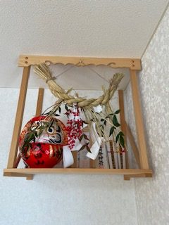 このお飾りは ナントお義父さんの手作り! ワラをなって 竹を割って 庭の南天を差して で、神棚にモこの通り~ お義父さんの器用さには脱帽です