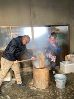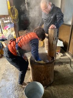 今日は年末の恒例イベント 旦那さんの実家で 『餅つき』ー! 早朝からお義父さんが 薪を焚いて蒸かしたもち米を 旦那さんと私で餅つき開始~ 年代物の杵と臼で 掛け声を掛けながらの共同作業蒸かし立てのもち米は とにかく熱い! で、重い!