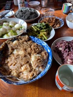 待ってましたー! つきたてお餅の食事会 大根おろしでサッパリと 炒ったゴマが良い香り お義母さんが炊いたあんこは優しい甘さ クルミ和えは絶品! 割ったクルミを殻から出して すりこぎですった手の掛かった一品