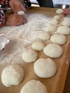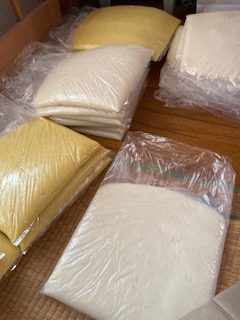 つきたてのお餅は 切り餅用に伸ばします 黄色いお餅はキビ入り~