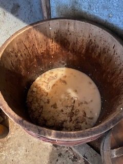 で、これをこれまた年代物の 味噌桶に投入~ お水を足してビチョビチョだけど これが美味しいお味噌になるのね~