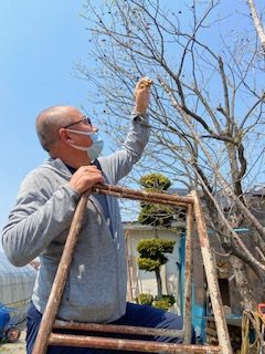 手が届かないところだから 旦那さんが脚立に上って収穫~ 早速、夕ご飯の食卓へ 熱々の天ぷらには 冷え冷えのビールでしょ!
