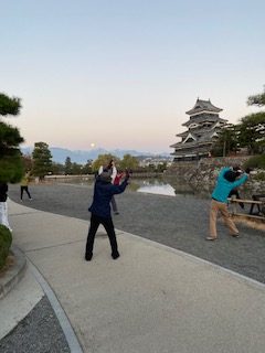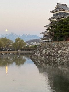 こんにちは! ひまわり不動産の増澤です 寒さに打ち勝って 朝ウォーキングへ と、夜明けのお月さまが ビックリするくらいキレイ! 吸い込まれるように 松本城の庭内へ松本城とお月さま なんて美しいの~ 写真に撮るとコンナだけど 実物は本当に大きくて 同じようにお月さまを 見上げてるいつもの面々が あれ? ラジオ体操?