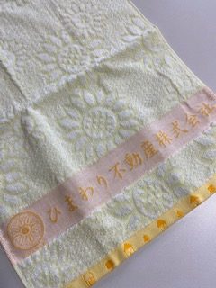 こんにちは! ひまわり不動産の増澤です ご挨拶や色々で使っている 会社用のタオルがコレ↓社名の両脇のひまわりが 可愛いでしょ~ で、広げるとこんな感じ