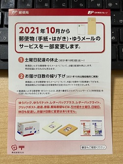 こんにちは! ひまわり不動産の増澤です 来月から郵便物のサービスが 変更になるだあ~メールが大半になったとはいえ お客様にハガキや郵便物を 良く送ります ナニナニ? ・土曜日の配達が無くなって ・普通郵便が1日遅くなる そうなんだ~ 残念だけど仕方ない だって自分で運ぶ事考えたら 郵便料金ってバカ安だもの で、追加の変更が・・・