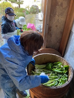 洗ったお菜を樽に漬けます この樽は年代物だから 長年培った菌の宝庫 お菜~塩~ザラメ~ 分量はお義母さんの目分量