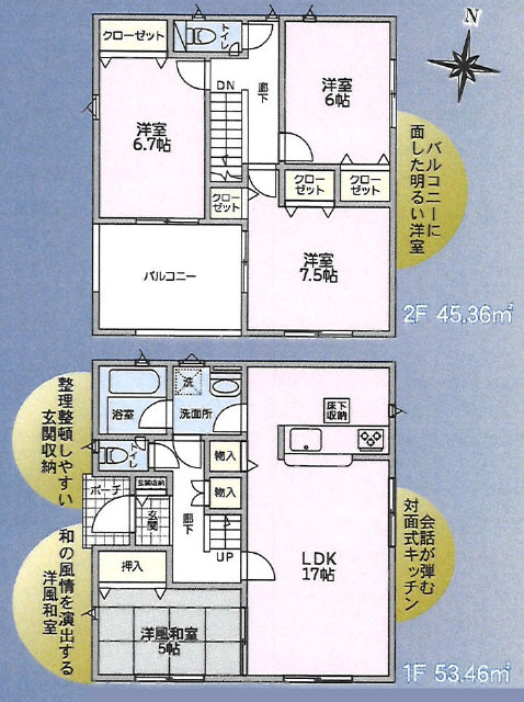 コンパクトな建物ですが、全居室に収納、2か所のトイレや浴室換気乾燥暖房機など設備も充実しています。