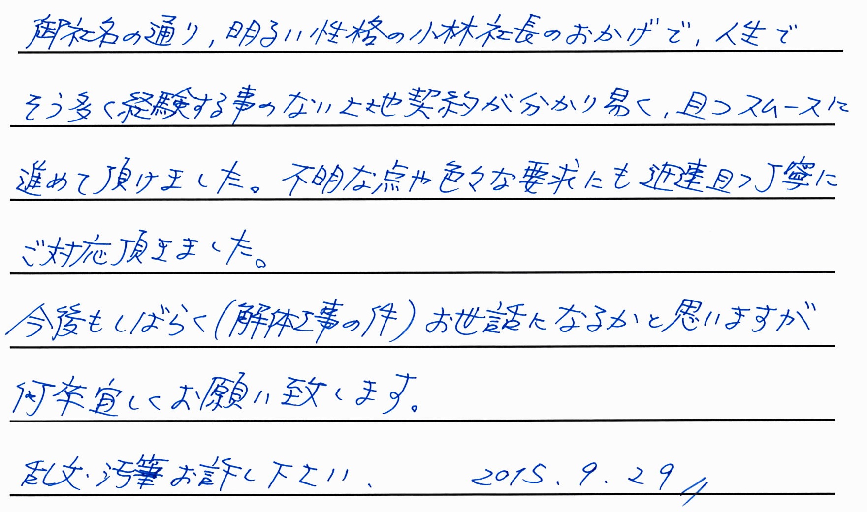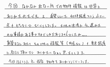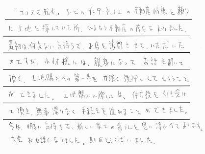 土地購入に際しては、仲介役を引き受けて頂き、無事滞りなく手続きを進めることができました。今は明るい気持ちで、新しい家での暮らしを思い浮かべております。