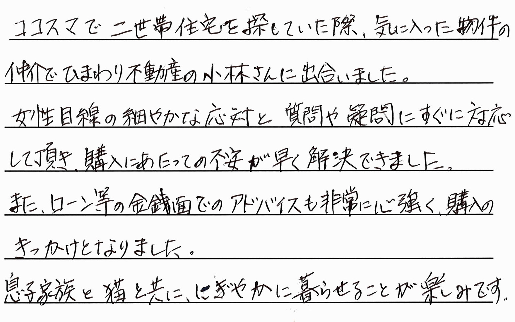 ココスマで二世帯住宅を探していた際、気に入った物件の仲介でひまわり不動産の小林さんに出会いました。