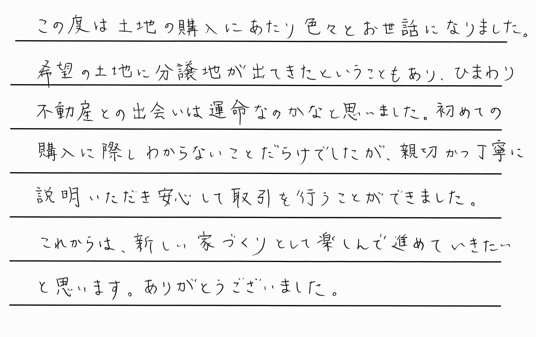 この度は土地の購入にあたり色々とお世話になりました。希望の土地に分譲地が出てきたということもあり、ひまわり不動産との出会いは運命なのかなと思いました。