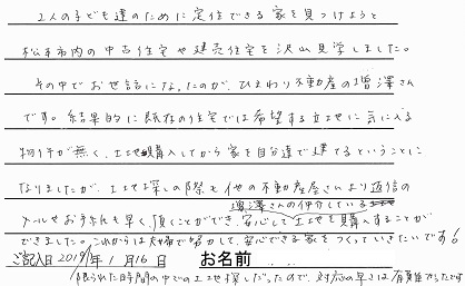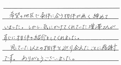 結果的に既存の住宅では希望する立地に気に入る物件が無く、土地購入してから家を自分達で建てるということになりましたが、土地探しの際も他の不動産屋さんより返信のメールやお手紙も早く頂くことができ安心して増澤さんの仲介している土地を購入することができました。限られた時間の中での土地探しだったので、対応の早さは有難かったです。