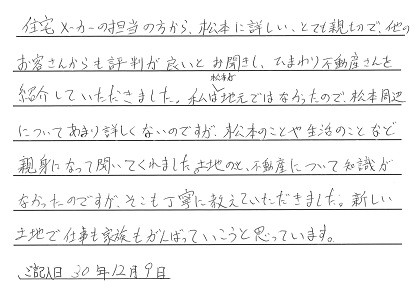 住宅メーカーの担当の方から、松本に詳しいとても親切で他のお客さんからも評判が良いとお聞きし、ひまわり不動産さんを紹介していただきました。