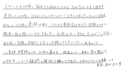 松本のこと、小学校・中学校のこと、土地の選び方、税金のこと・・・本当に色々教えていただき、一つ一つ疑問を解消して購入できました。ひまわりさんにお願いして本当に良かったです。
