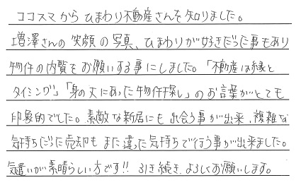 素敵な新居にも出会う事が出来、複雑な気持ちだった売却もまた違った気持ちで行う事が出来ました。気遣いが素晴らしい方です!!引き続きよろしくお願いします。